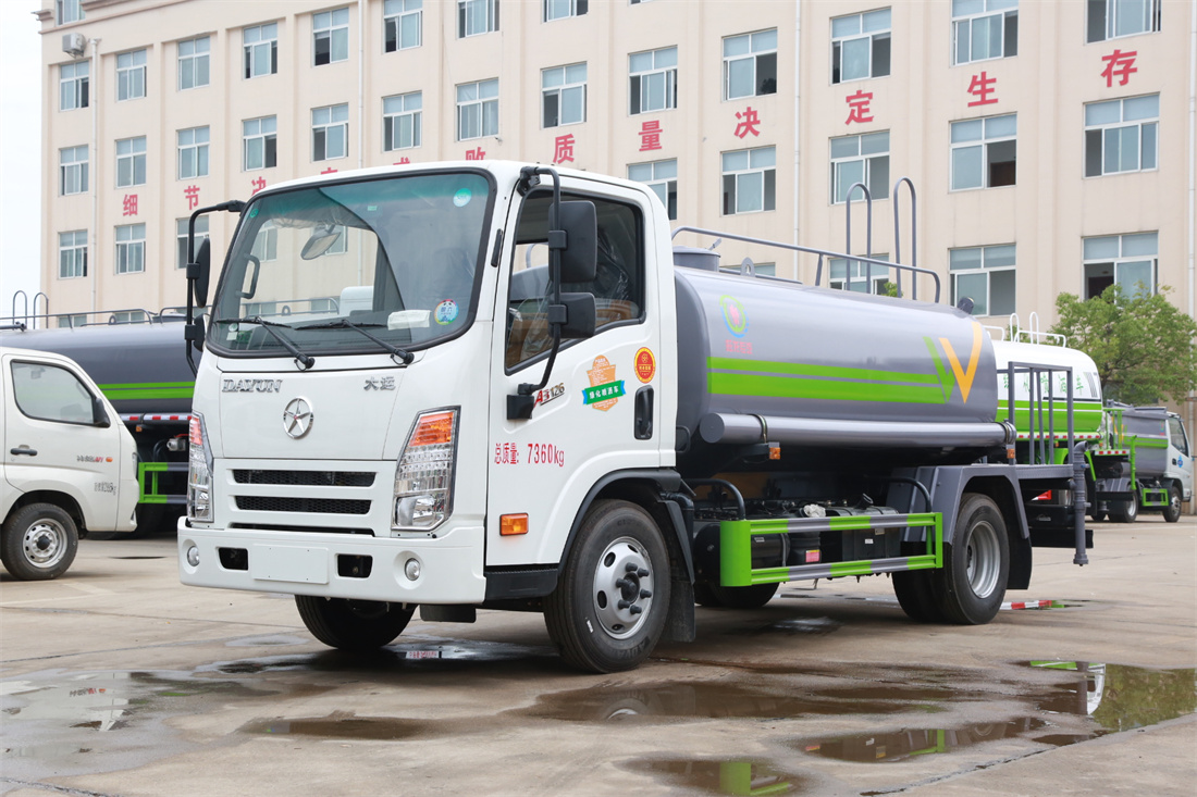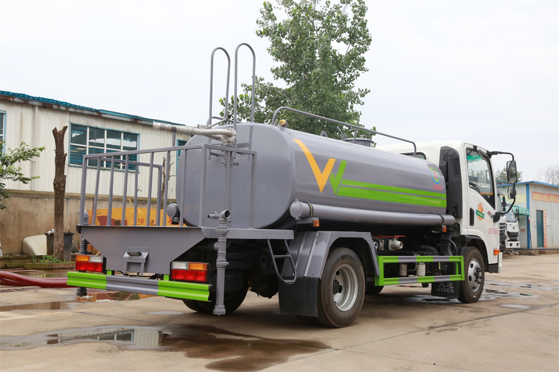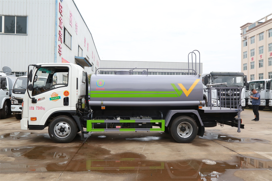灑水車前裝有鴨形噴嘴或圓頭沖嘴,后面裝有圓柱開(kāi)灑水噴嘴或蓮蓬頭噴嘴,后部有一工作平臺(tái),裝配有水炮。后部還可裝8個(gè)噴嘴(選裝)。