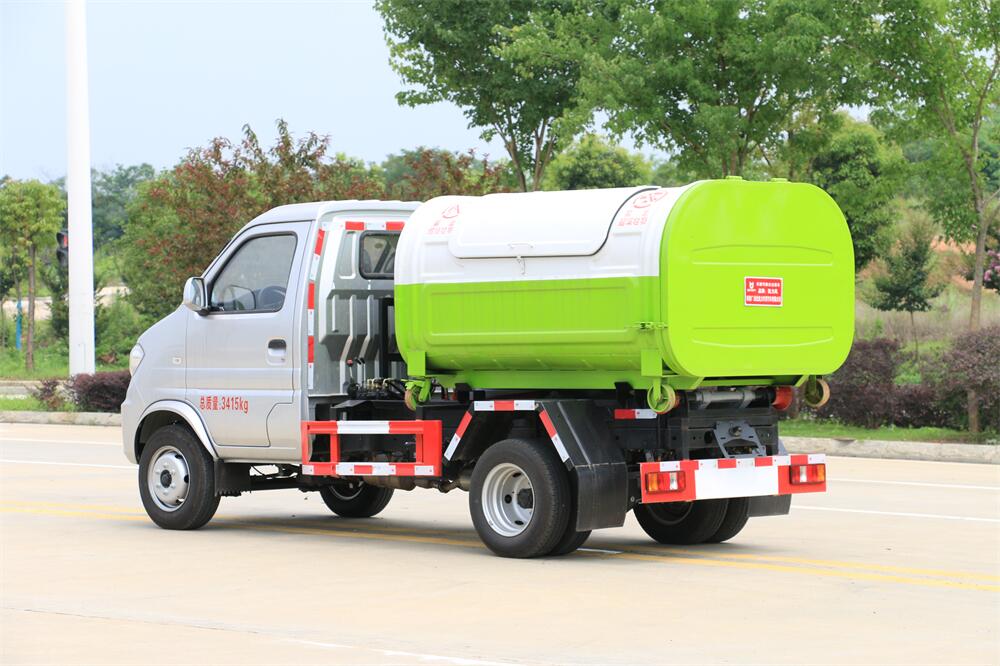 該款鉤臂式垃圾車由液壓系統、操作系統組成。舉升油制缸(1支)系國內知名液壓件廠家生產的雙作用油缸。垃圾廂可自吊上放下,可自行傾倒垃圾,上下一次工作循環時間≤50S。該車的特點是一個車能配多個垃圾廂,能實現一臺車與多個垃圾廂聯合作業,循環運輸,充分提高了車輛的運輸能力。