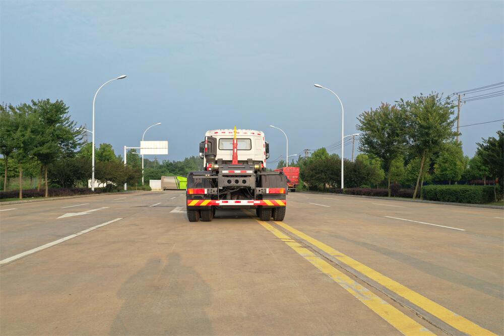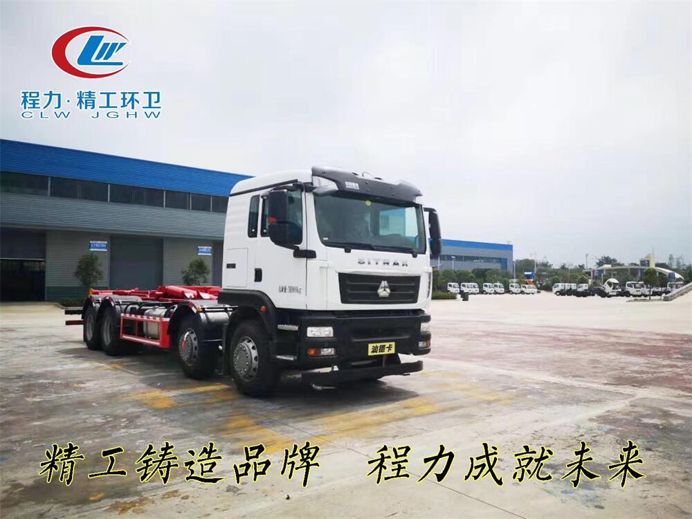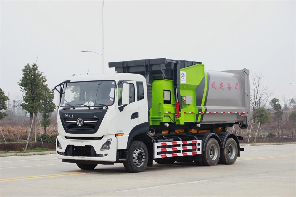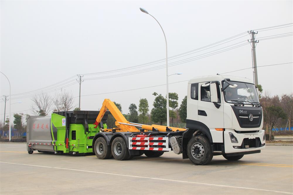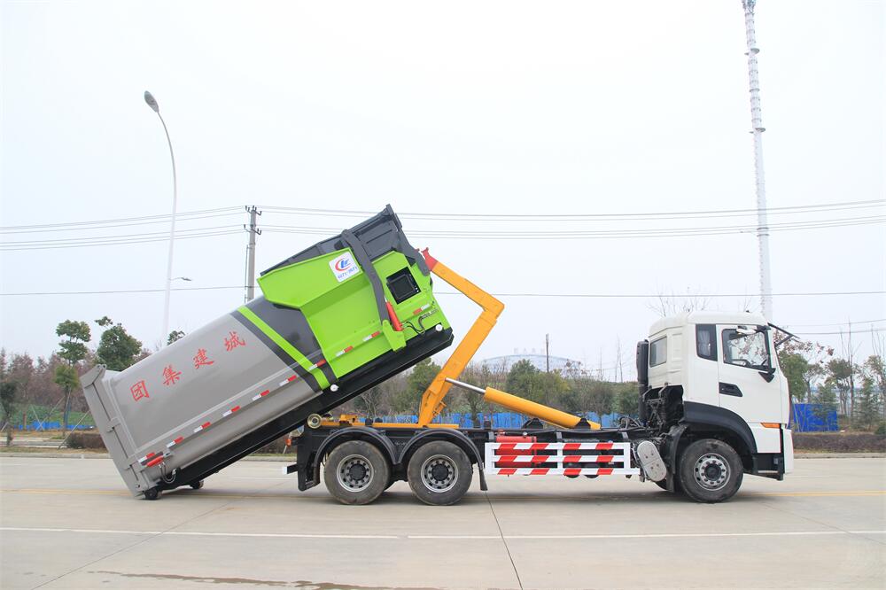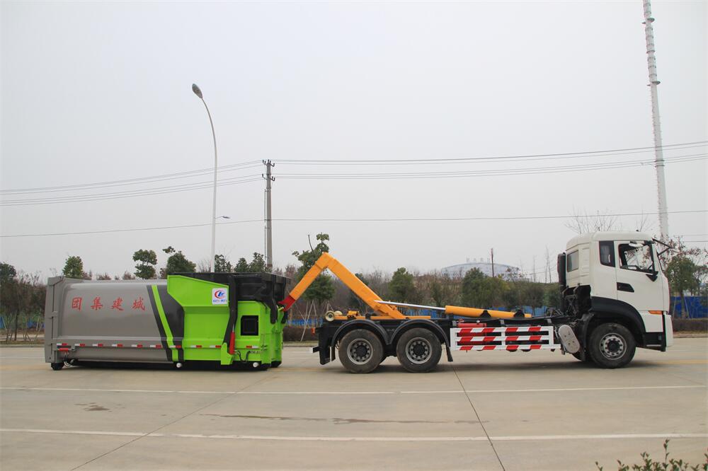 勾臂式垃圾車(車廂可卸式垃圾車)介紹: 車廂可卸式垃圾車又叫拉臂式垃圾車,是一種采用高新設(shè)計(jì)可伸縮的鉤臂,實(shí)現(xiàn)垃圾廂的二次吊裝,自吊上放下,可自行傾倒垃圾的環(huán)衛(wèi)設(shè)備。 拉臂式垃圾車結(jié)構(gòu)簡單,操作穩(wěn)定方便,裝卸效率高,機(jī)械化程度高,節(jié)省人力。鉤臂垃圾車一車可帶多個(gè)垃圾廂,在裝卸的運(yùn)輸過程中可有效地避免二次污染。 拉臂垃圾車采用高新設(shè)計(jì)可擺動的鉤臂,垃圾箱由框架、開啟油缸、滑輪、后門和若干加強(qiáng)框架與鋼板焊接而成。調(diào)換貨廂快捷方便,貨廂上帶蓋(倒垃圾時(shí)可翻開),鉤臂垃圾車?yán)鴰w可選用碳鋼、不銹鋼材質(zhì)、內(nèi)部采取環(huán)氧樹脂防腐處理,改裝部分與原車底盤為可分離式,維修方便且保持了原車的機(jī)動性及行駛性能。