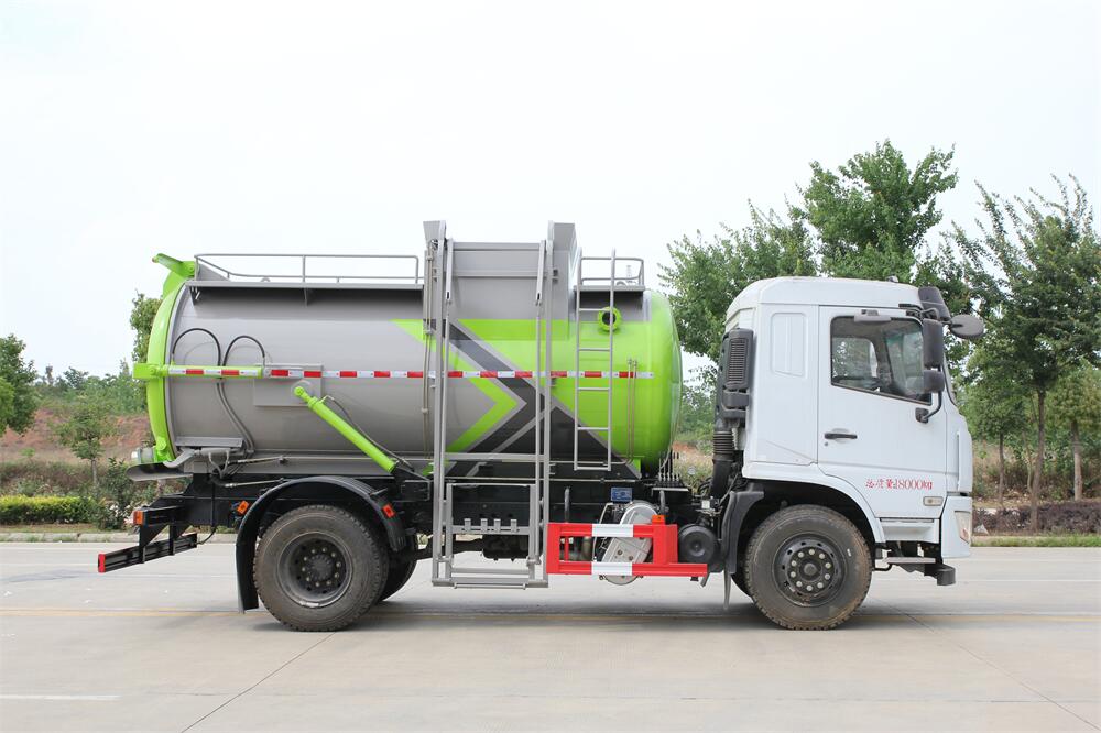 上裝配置:罐體容積10m3,配備120L/240L掛桶提升翻轉機構,液壓系統,后蓋液壓鎖緊開啟,罐體可以舉升自卸,尾部帶自流閥;用于運輸液態垃圾,其特點操作簡單,密封性好,無泄漏,無異味;可選裝固液分離功能,推板擠壓功能,常用于餐館的垃圾轉運處理。