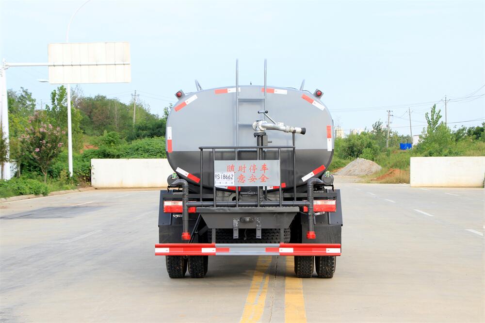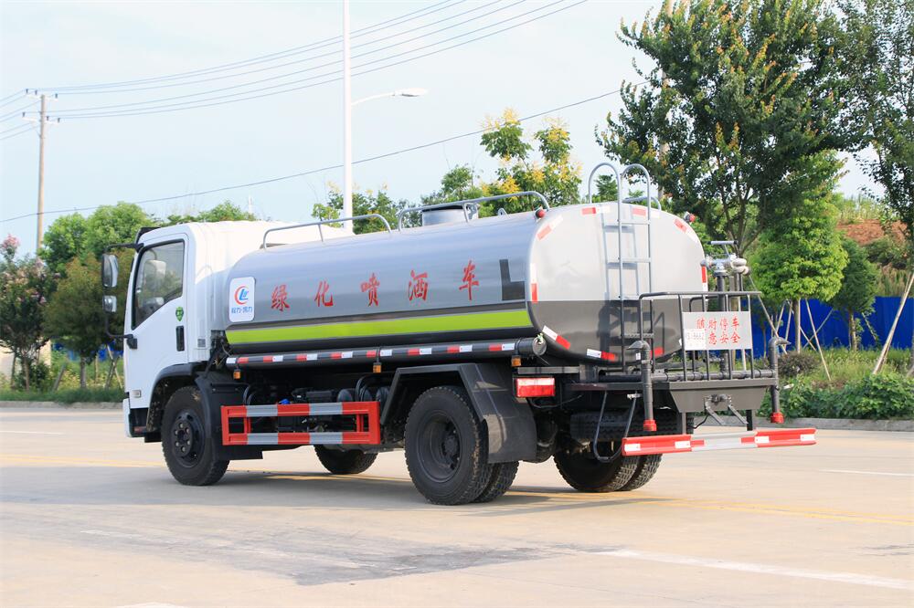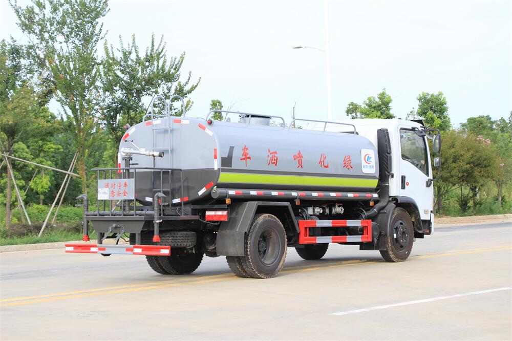 灑水車前裝有鴨形噴嘴或圓頭沖嘴,后面裝有圓柱開(kāi)灑水噴嘴或蓮蓬頭噴嘴,后部有一工作平臺(tái),裝配有水炮。后部還可裝8個(gè)噴嘴(選裝)。