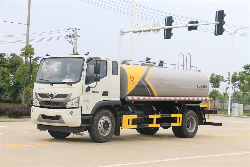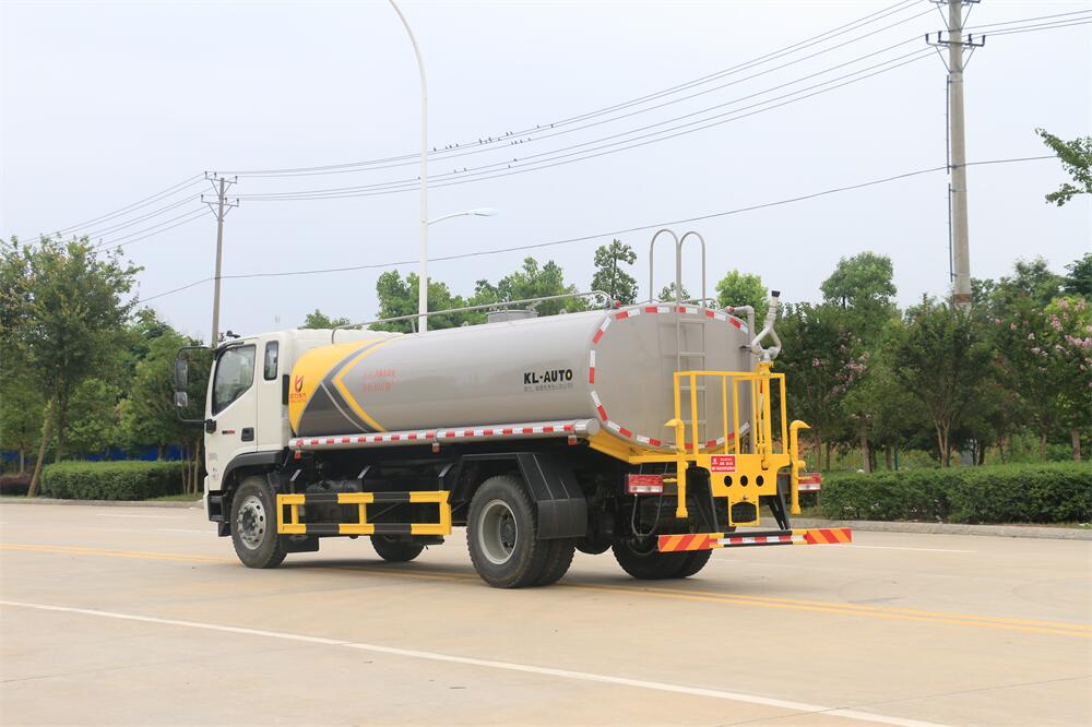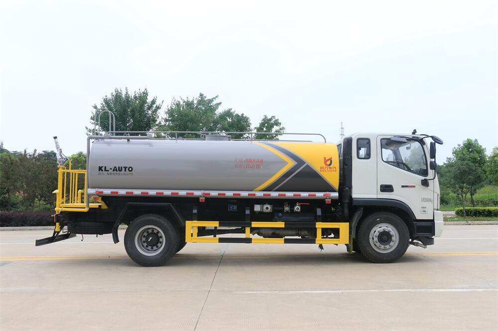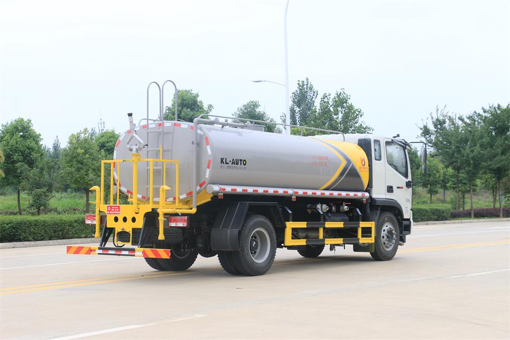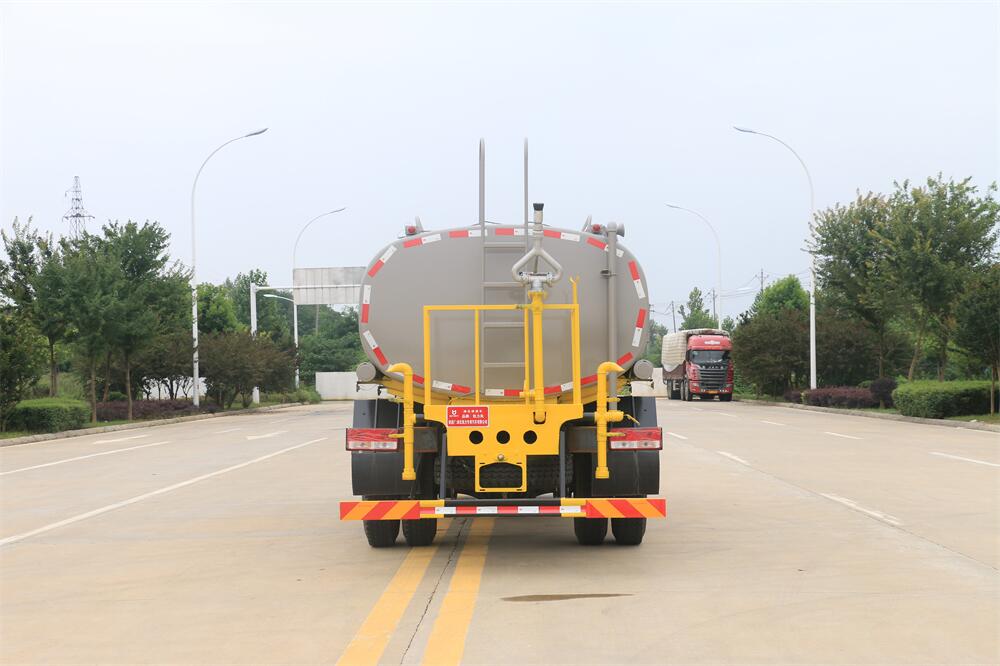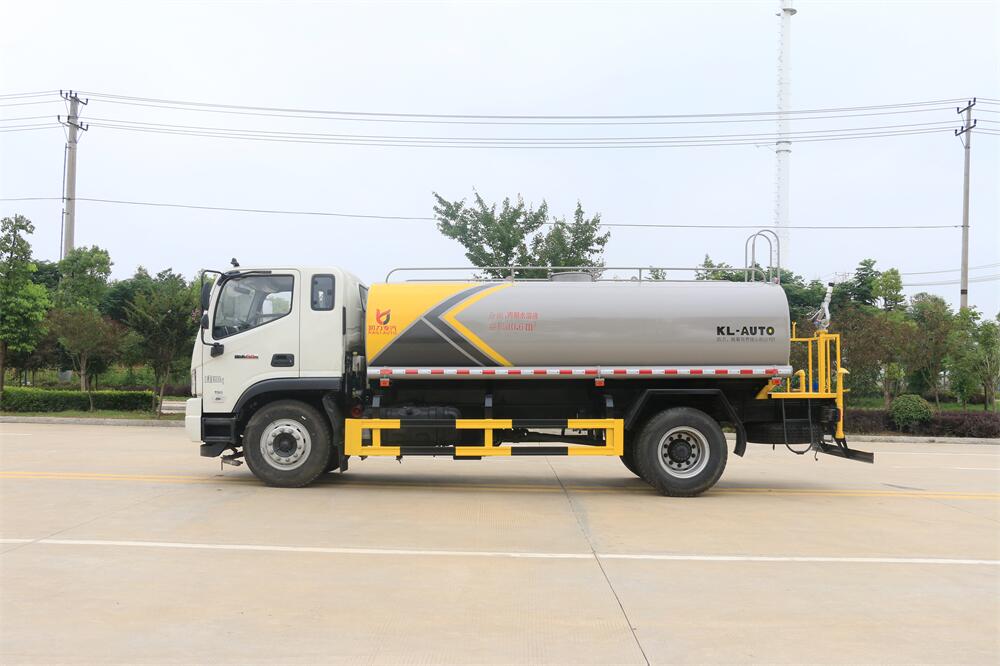 灑水車(chē)前裝有鴨形噴嘴或圓頭沖嘴,后面裝有圓柱開(kāi)灑水噴嘴或蓮蓬頭噴嘴,后部有一工作平臺(tái),裝配有水炮。后部還可裝8個(gè)噴嘴(選裝)。