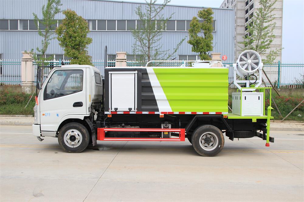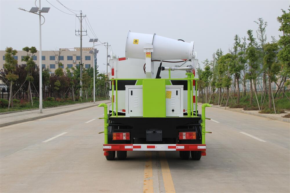 上裝配置:罐體容積為 5立方,選配風(fēng)送式霧炮機(jī)組射程30米、40米、50米、60米、80米、100米、120米霧炮,罐體鋼板為4mm碳鋼Q235材質(zhì),罐內(nèi)隔板具有防波作用,以減輕汽車行駛時(shí)罐體液體沖擊,罐體及整車外形尺寸按照公告。帶大功率專用灑水泵,泵可自吸自排,整車前沖、后灑、側(cè)噴、帶65消防接口,后平臺(tái)配CLW-50、CLW-60、CLW-80、CLW-100、CLW-120型風(fēng)送式霧炮機(jī)組;罐體前封頭配大功率柴油發(fā)電機(jī)組;前封頭帶水位計(jì),后平臺(tái)主管路帶1寸澆花接口,后爬梯。帶兩根輸水管及陰陽端。罐體顏色:銀/灰/綠,罐體兩側(cè)噴“多功能抑塵車”字樣,貼反光標(biāo)示。