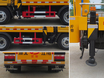 后伸:600mm;隨底盤選裝駕駛室;吊鉤為選裝件;側面防護及后下部防護裝置材料材質:Q235,連接方式:焊接加螺栓連接;后下部防護裝置斷面尺寸(寬贅?:30?00(mm),離地高度:380mm;ABS廠家及型號:襄陽東風隆誠機械有限責任公司/ABS/ASR-24V-4S/4M;主要專用裝置為折疊臂,用于搶修電力、通訊、路燈等高空作業.